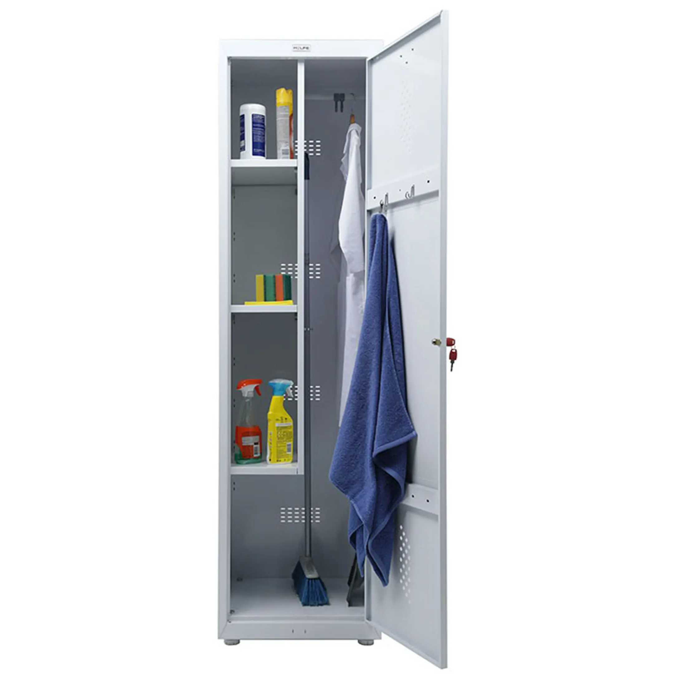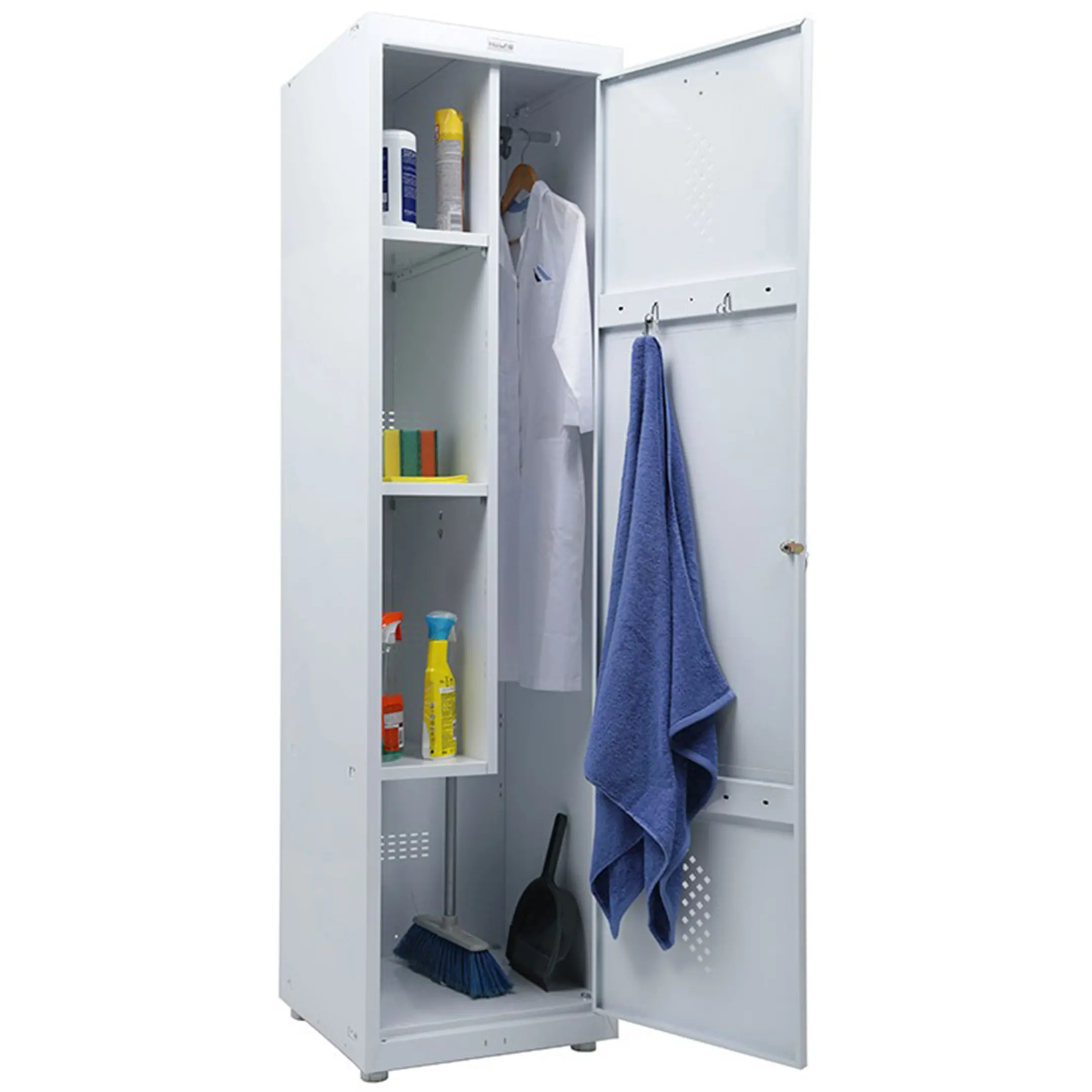 • Комплектация: вертикальная перегородка, 3 полки под хозяйственный инвентарь, держатель для швабры, крючки для одежды, перекладина для плечиков;