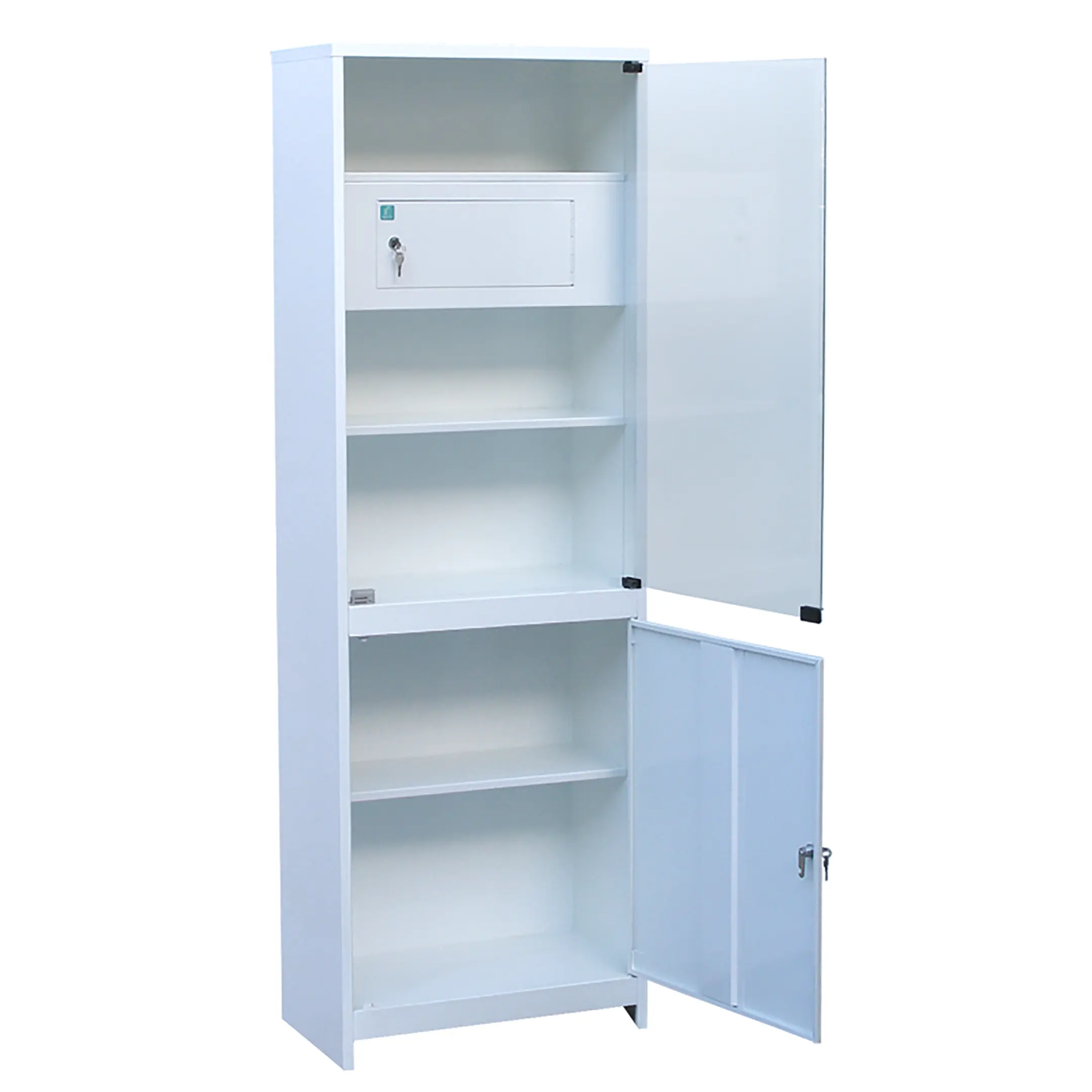 • запираемая металлическая дверь и одна стационарная металлическая полка - в нижнем отделении;