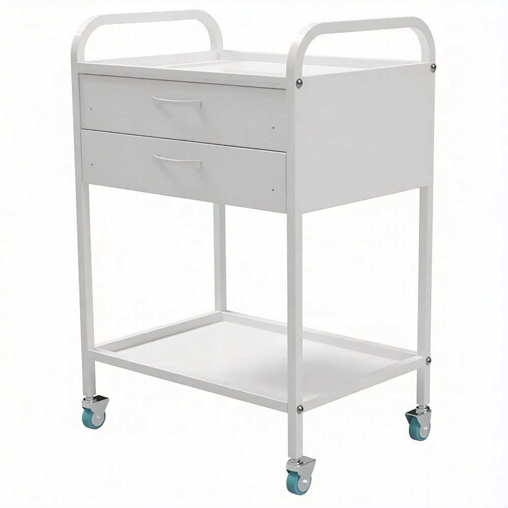 Стол медицинский инструментальный СМИ-02-02 (полки металл, колёса серая резина) предназначен для размещения инструмента, лекарственных препаратов и приборов.
