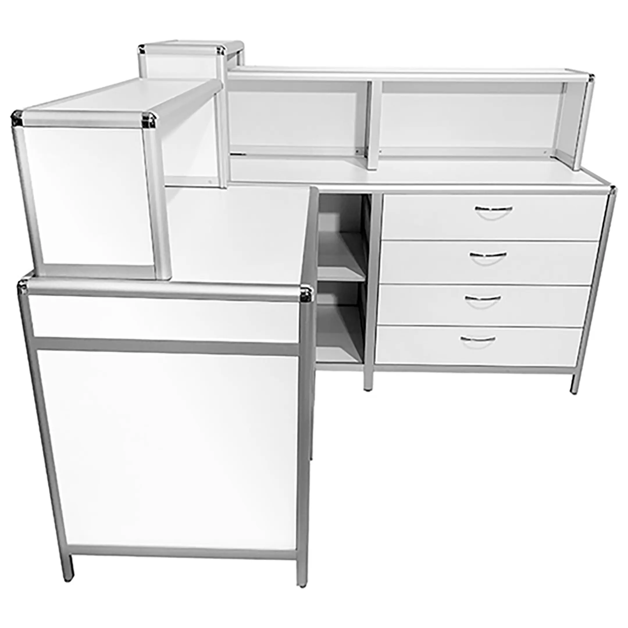 - Качественные материалы — обшивка из ЛДСП 8 мм, столешницы из ЛДСП 16 мм белого цвета, устойчивые к влажной уборке и обработке дезинфицирующими средствами.