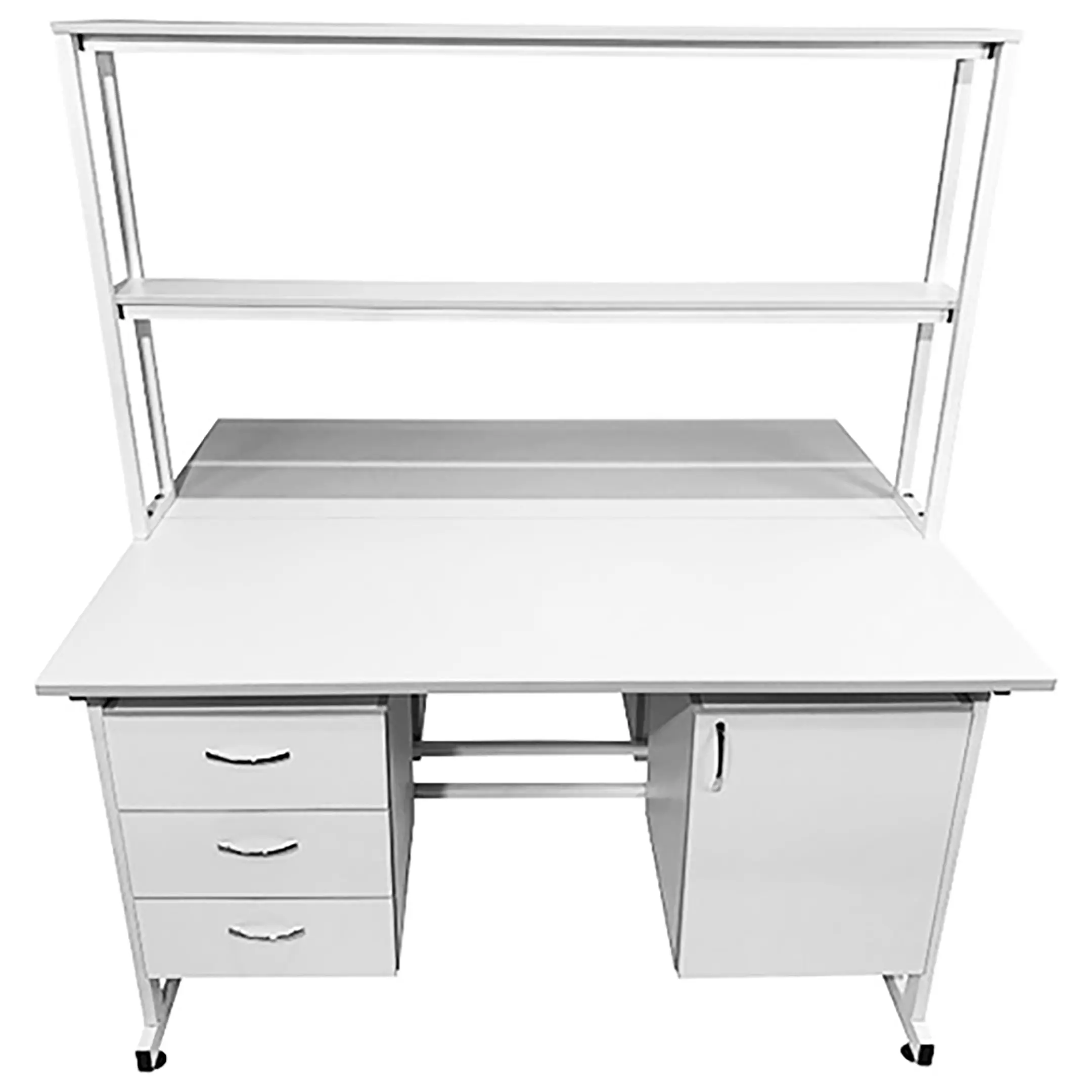 Стол лабораторный островной с надстройкой Сло 22.018 (белый) — это прекрасное решение для организации сразу двух рабочих мест в лабораториях и медицинских учреждениях. Модель оснащена двумя рабочими местами, каждое с двумя подвесными тумбами: слева с тремя выдвижными ящиками, справа с распашной дверкой и полкой, а также центральной надстройкой с двумя полками. Каркас выполнен из стального профиля, столешницы из ЛДСП толщиной 22 мм.