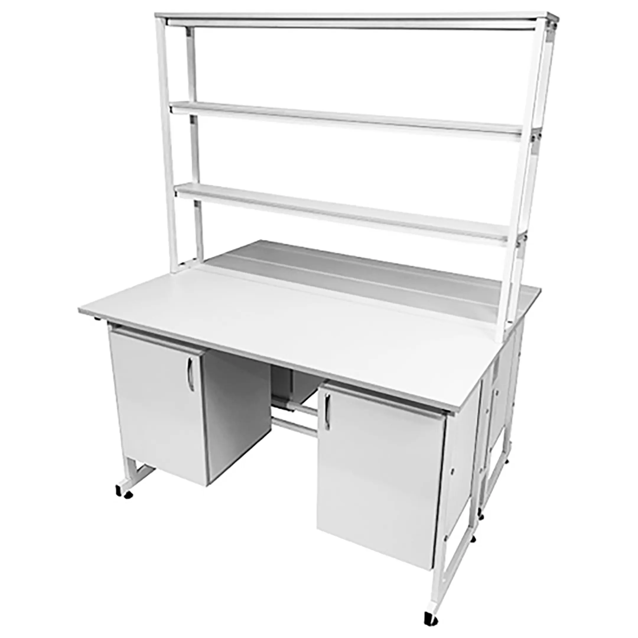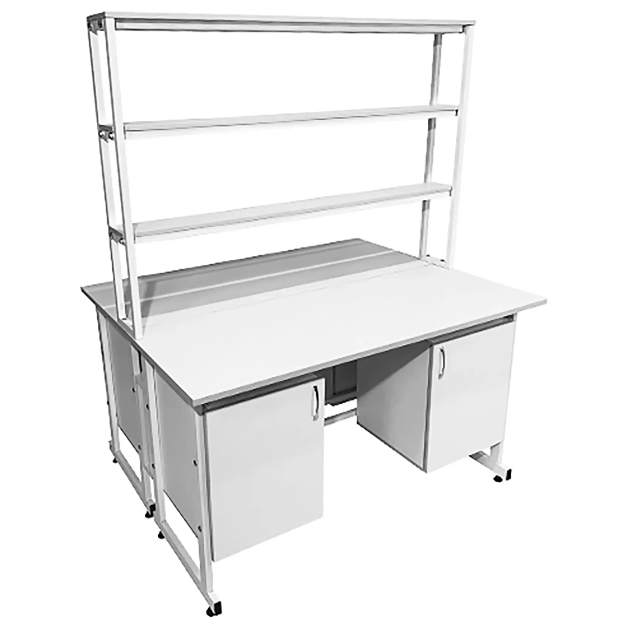 Стол лабораторный островной с надстройкой Сло 22.022 (белый) — это практичное и многофункциональное решение для организации рабочих мест в лабораториях и медицинских учреждениях. Модель позволяет удобно разместить сразу два рабочих места, максимально используя доступное пространство. Каждое рабочее место оснащено двумя подвесными тумбами с распашными дверками и полками, а центральная надстройка имеет три полки. Каркас выполнен из стального профиля, столешницы из ЛДСП толщиной 22 мм.