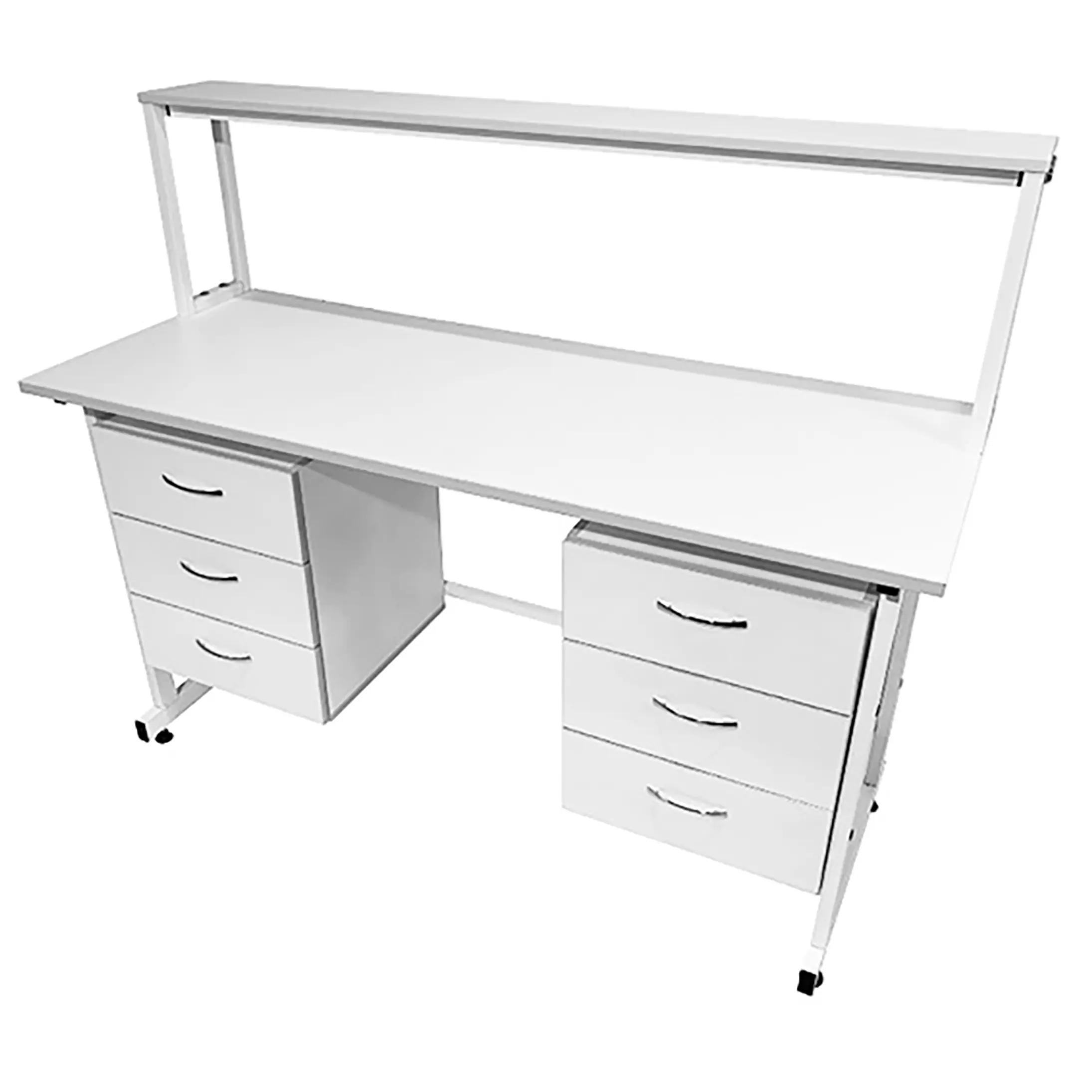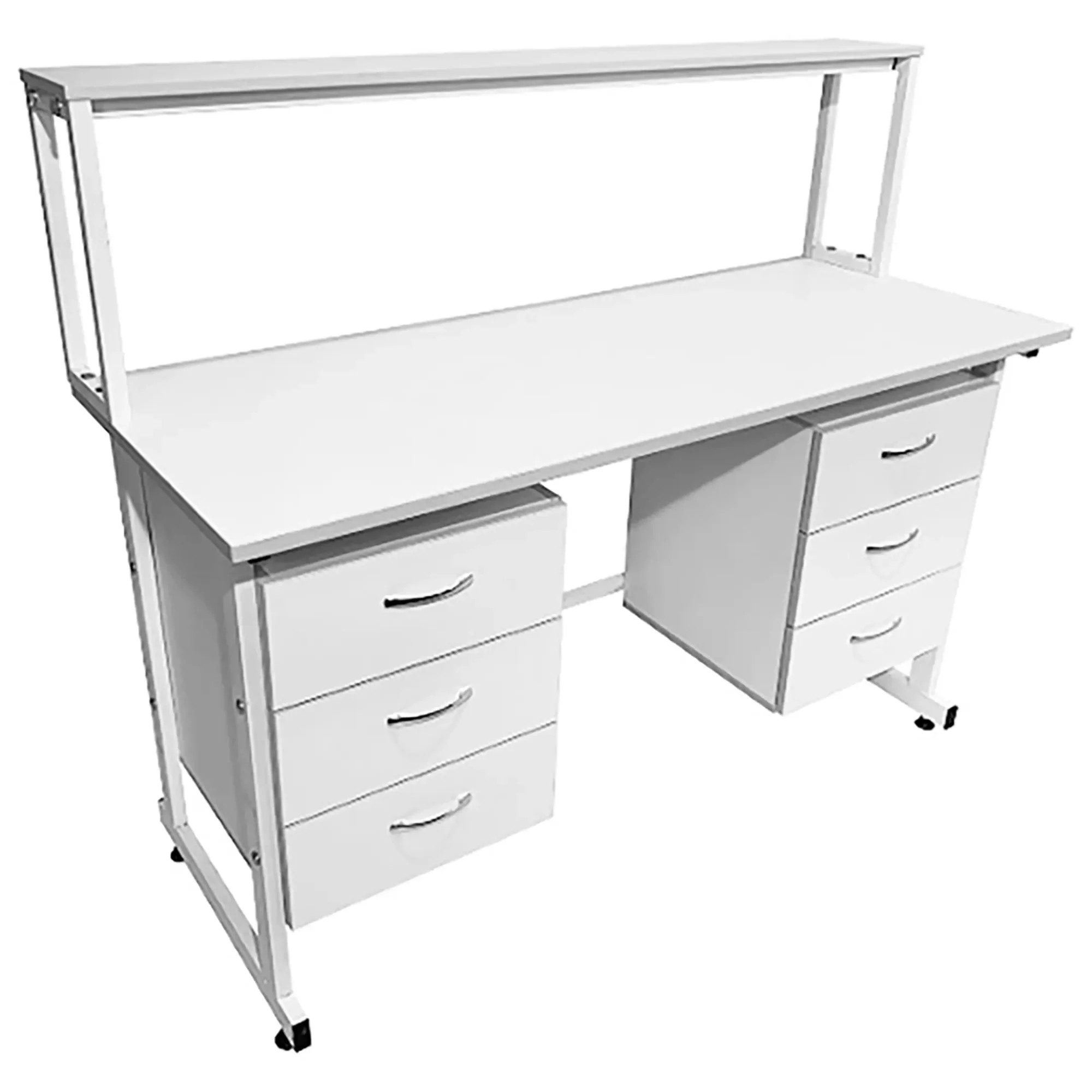 Стол лабораторный с надстройкой СЛн 16.015 (белый) — это идеальное решение для создания функционального и удобного рабочего места лаборанта, занимающегося проведением химических исследований. Модель оснащена двумя боковыми подвесными тумбами с тремя выдвижными ящиками каждая, надстройкой с одной полкой и металлическим защитным экраном. Каркас выполнен из стального профиля, столешница из ЛДСП толщиной 22 мм.