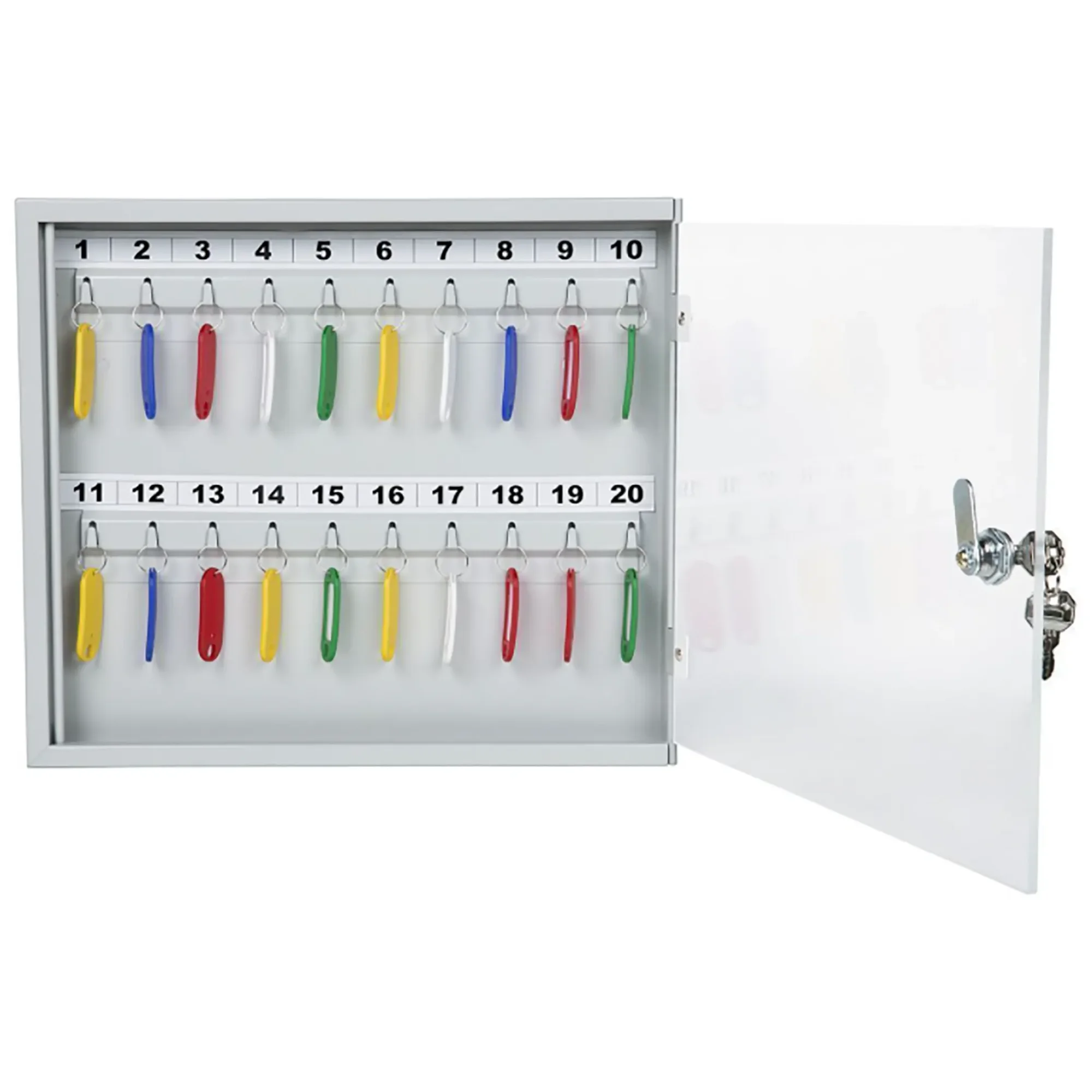 Ключница с прозрачной дверцей КЛС-20 (с брелками) — это практичная и наглядная система для организованного хранения ключей в учреждениях и на предприятиях. Конструкция со стеклянной дверцей и полным комплектом брелков обеспечивает удобный визуальный контроль, быстрый поиск и надежную защиту для 20 комплектов ключей.