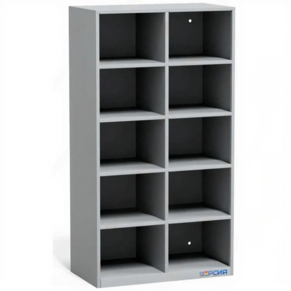 - Оптимальная вместимость для малой группы — 10 индивидуальных ячеек достаточно для хранения обуви небольшой семьи, 2-3 сотрудников офиса, мини-группы в развивающем центре или пары гостей.