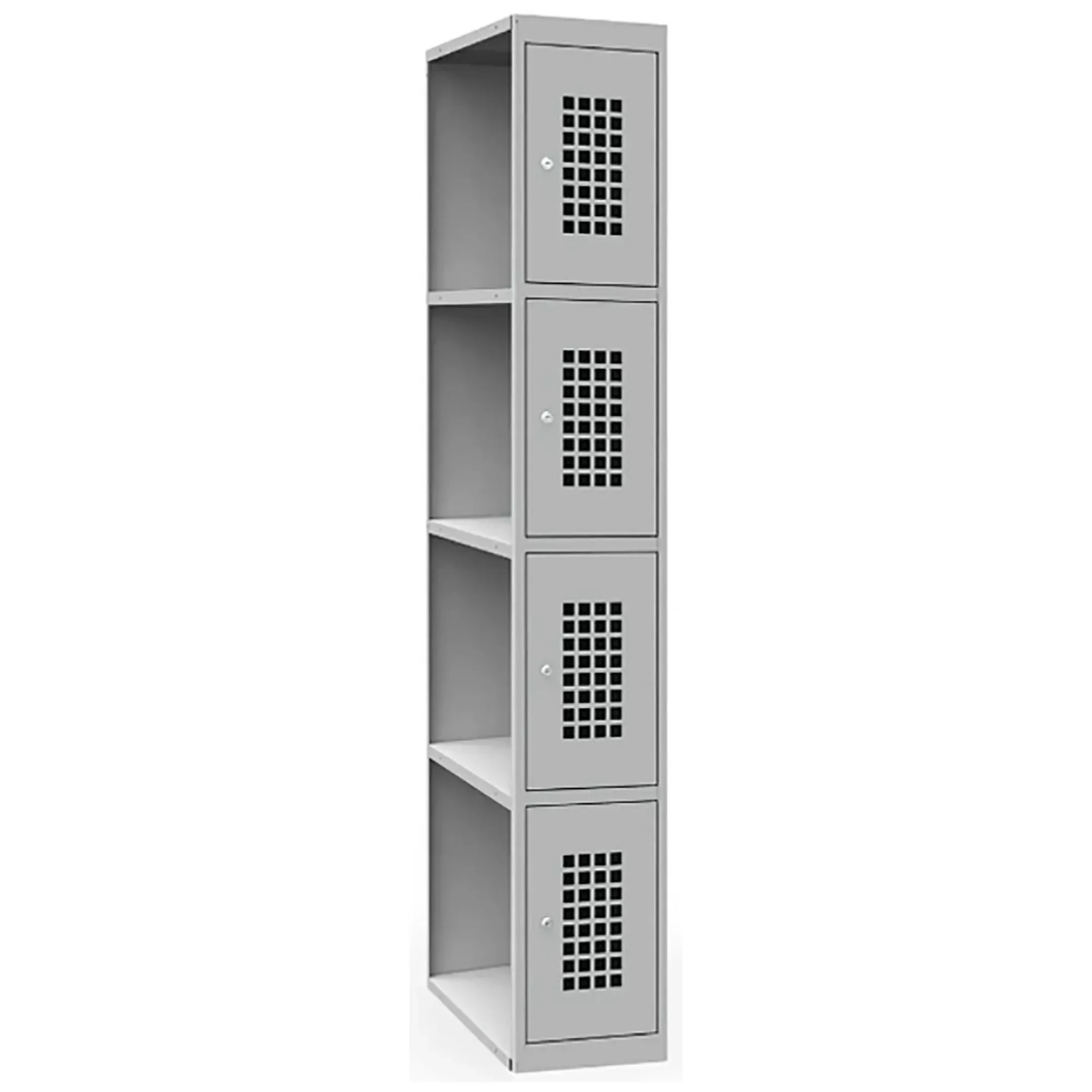 - Перфорированные дверцы для вентиляции — отверстия в дверцах обеспечивают постоянный воздухообмен внутри ячеек, что способствует проветриванию одежды и обуви, предотвращая появление сырости и неприятных запахов.