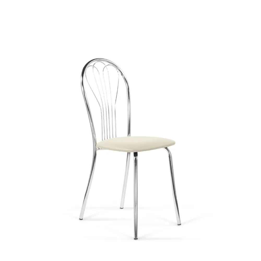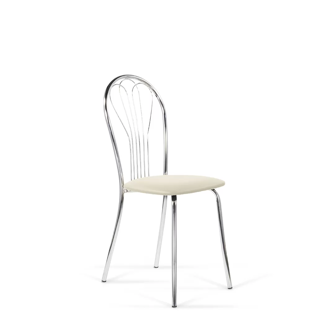 Небольшой стул с округлой спинкой и мягким сиденьем может выступать как часть обеденной зоны, а может быть самостоятельной деталью в интерьере. Каркас стула выполнен из хромированного металла.