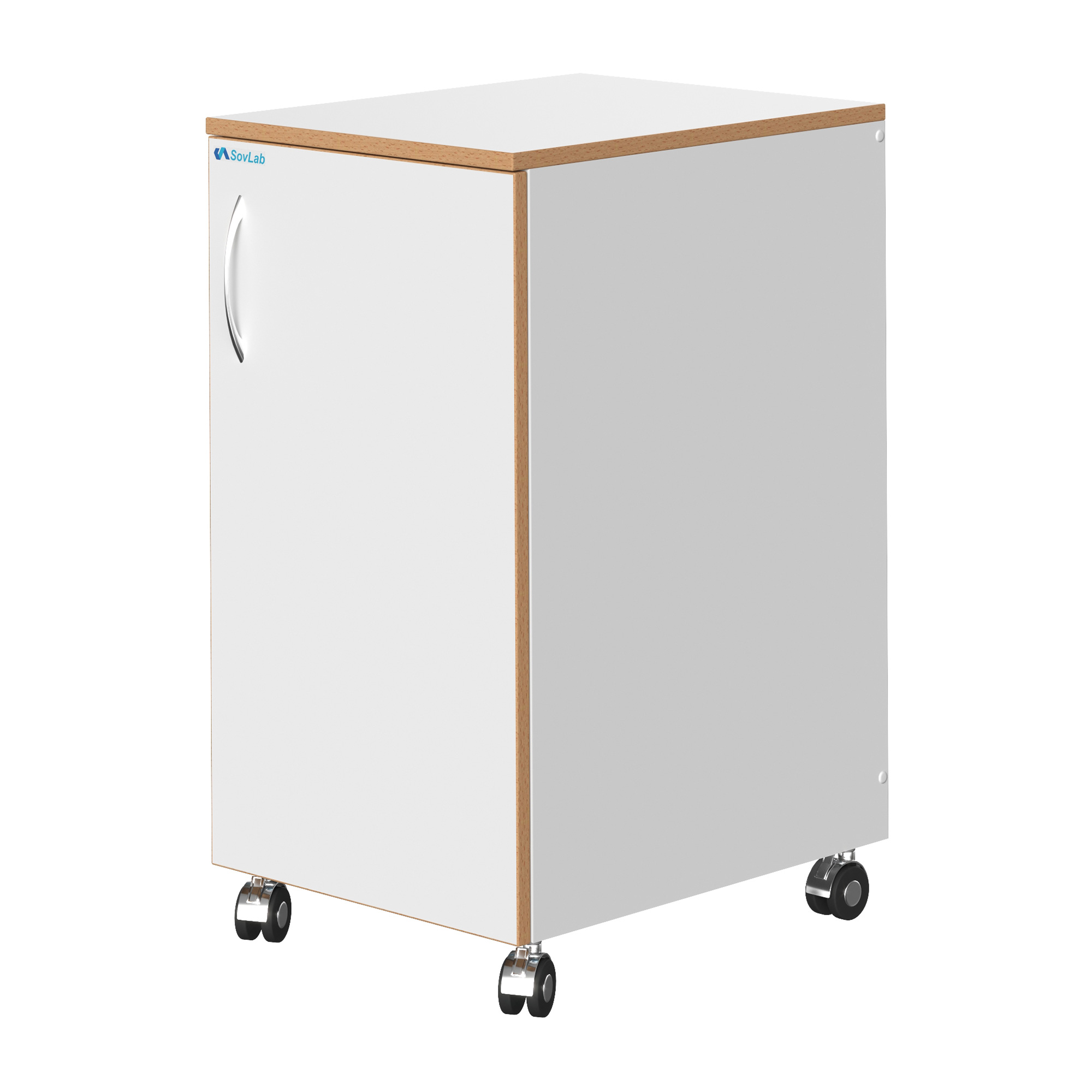 - Мобильность и фиксация — роликовые опоры диаметром 50 мм со стопорами позволяют легко перемещать тумбу и надежно фиксировать ее на месте.