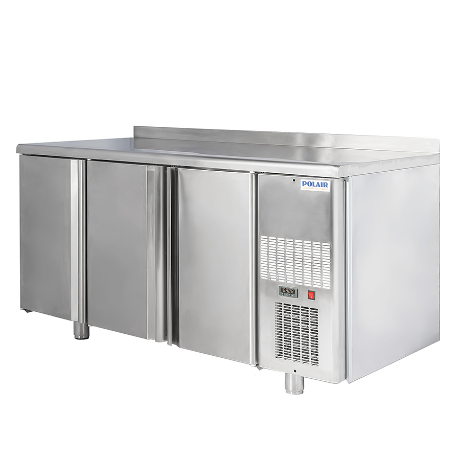 Дополнительные характеристики Материал столешницы: нержавеющая сталь Тип оттайки: автоматическая, с системой испарения конденсата Тип охлаждения: динамический Хладагент: R134a Толщина стенки корпуса: 43 мм Толщина столешницы: 40 мм Описание Вместительный охлаждаемый стол POLAIR TM3-G предназначен для установки в ресторанах и столовых. Благодаря увеличенной площади столешницы оборудование может использоваться в качестве прилавка в павильонах уличной торговли и на продуктовых рынках. Нижнюю часть охлаждаемого стола POLAIR TM3-G можно разделить на 4 зоны. Справа установлен двухъярусный агрегат, который при необходимости легко выдвигается из корпуса стола. Рабочая камера разделена на 3 отсека, для каждого из которых предусмотрена отдельная герметичная дверь. Таким образом, POLAIR TM3-G позволяет хранить несколько видов продуктов, избавляя от трат на покупку дополнительного холодильного оборудования – витрины или шкафа.