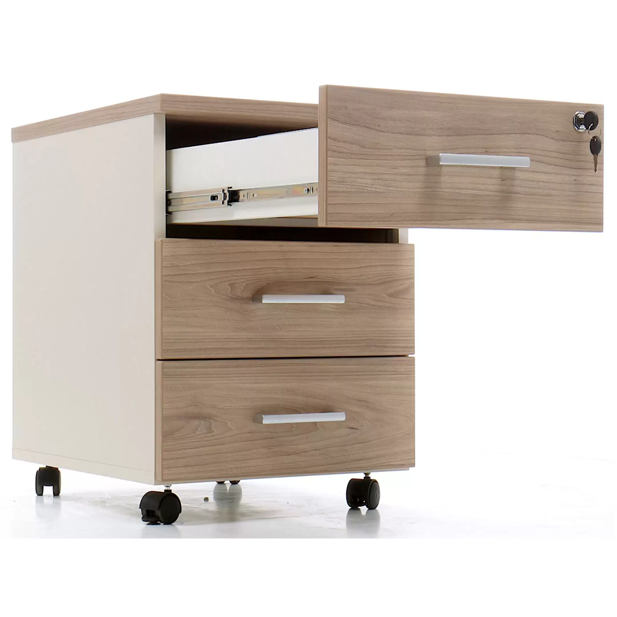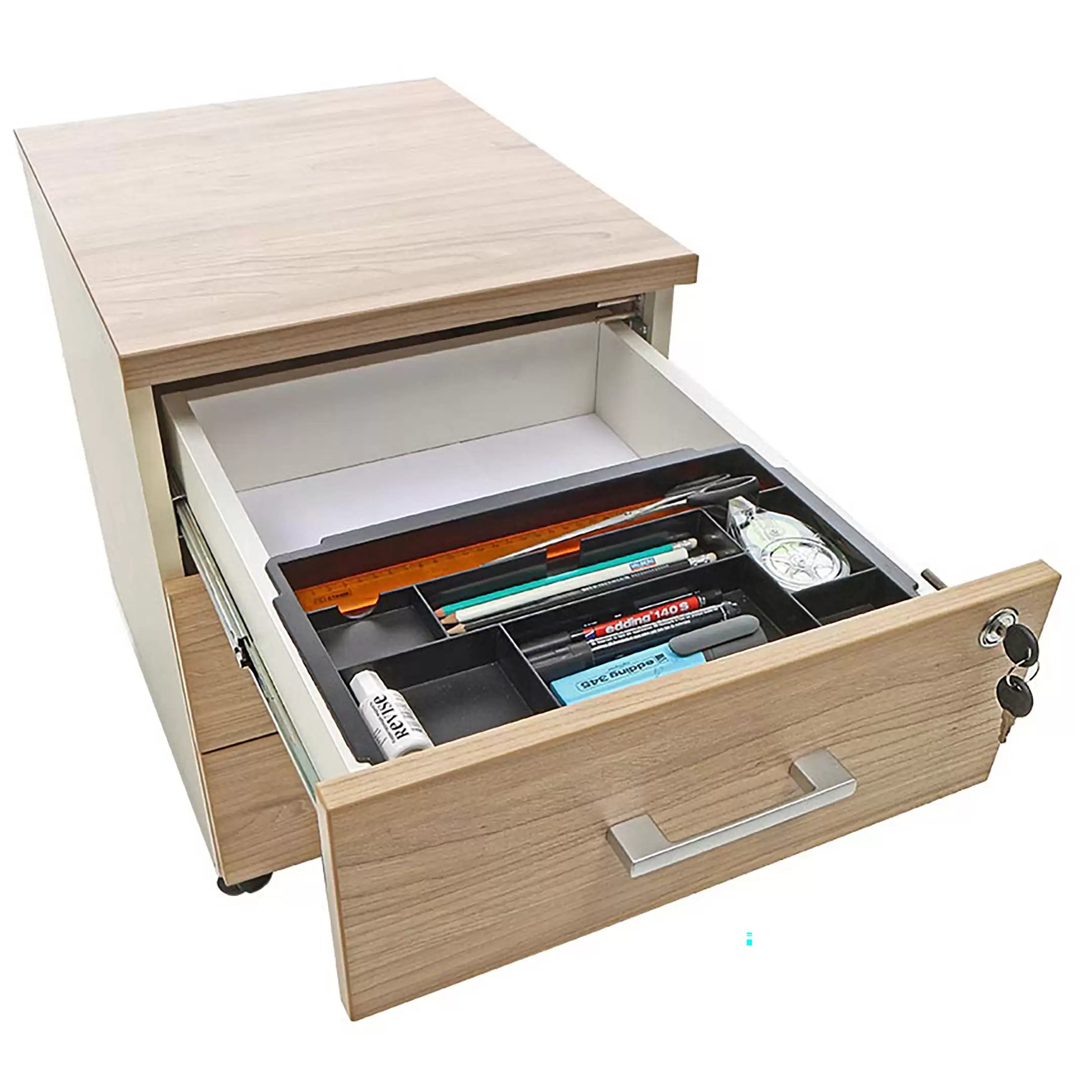 • запирается центральным замком и оснащена пластмассовым лотком для канцелярских принадлежностей в верхнем ящике;
