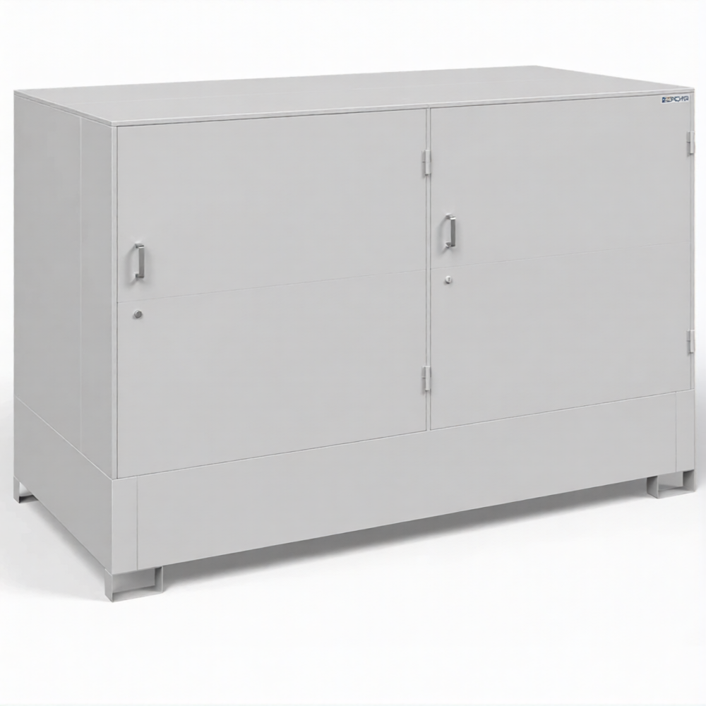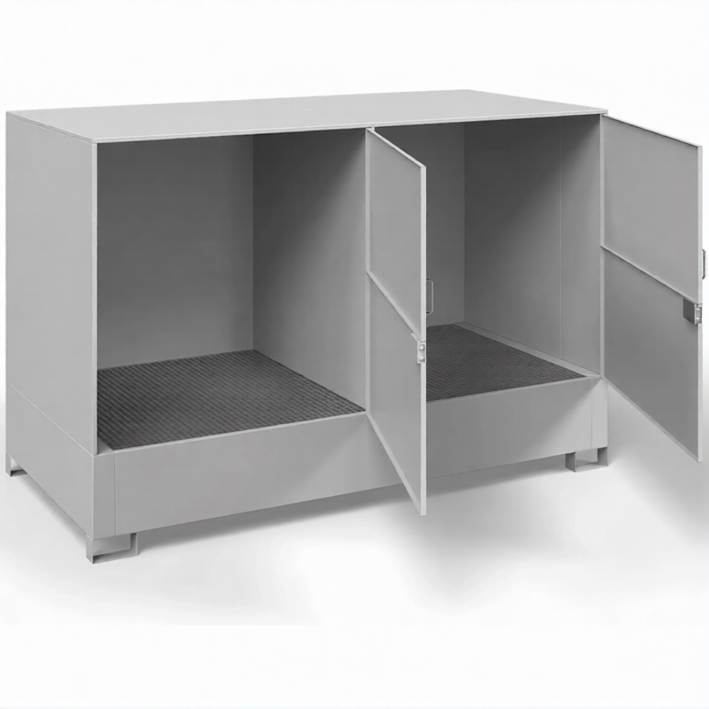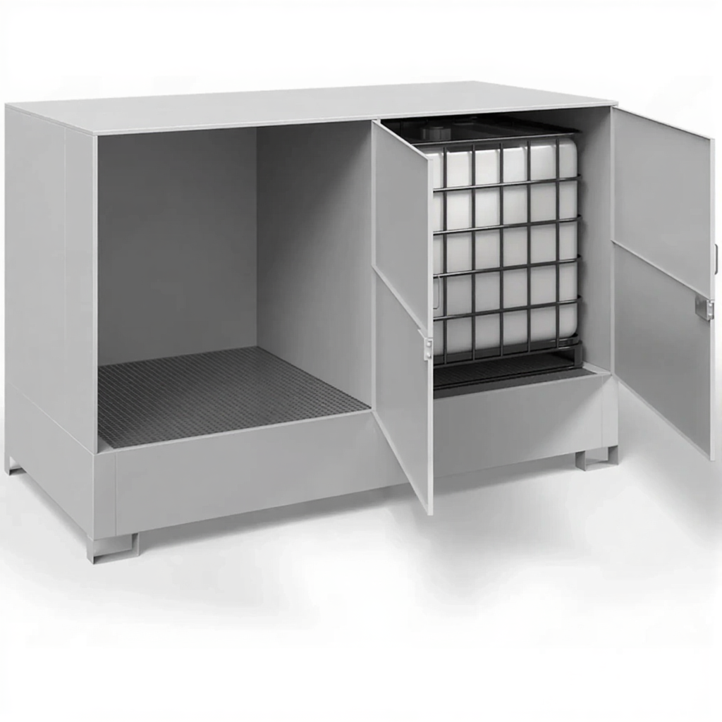 Шкаф для 2-х еврокубов ДКБ-2700, решетчатый настил, сточный поддон — это промышленное и надежное решение для безопасного и организованного хранения еврокубов (IBC-контейнеров) с жидкими и сыпучими материалами на предприятиях, складах и в логистических комплексах. Модель ДКБ-2700 представляет собой усиленную металлическую конструкцию, рассчитанную на размещение двух стандартных еврокубов, и оснащенную ключевыми элементами безопасности: решетчатым настилом для удобства обслуживания и сточным поддоном для сбора аварийных проливов.
