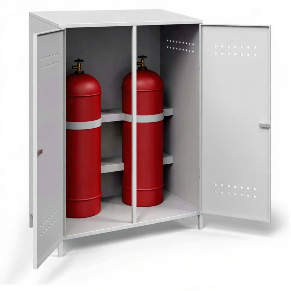 - Надежная защита имущества и строгое соответствие нормативам — усиленный корпус с мощным запирающим механизмом гарантированно предотвращает несанкционированный доступ и кражу баллонов. Использование такого шкафа является безупречным решением для выполнения требований пожарных инспекций, правил ПБ и ГОСТ на промышленных предприятиях.