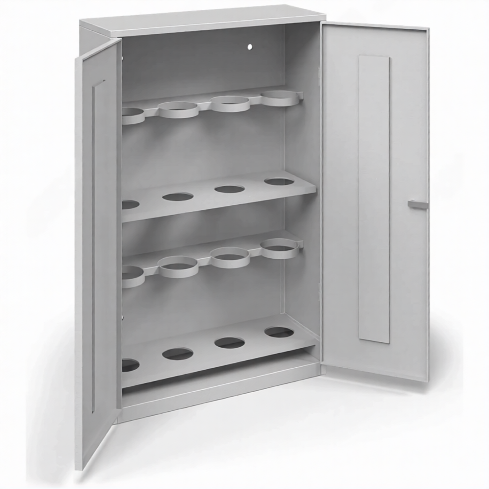 - Надежная защита имущества и организованное хранение — запирающаяся дверь защищает баллоны от краж и несанкционированного доступа. Узкий шкаф позволяет навести порядок и безопасно хранить баллоны в местах, где они раньше могли стоять незакрепленными, создавая угрозу.