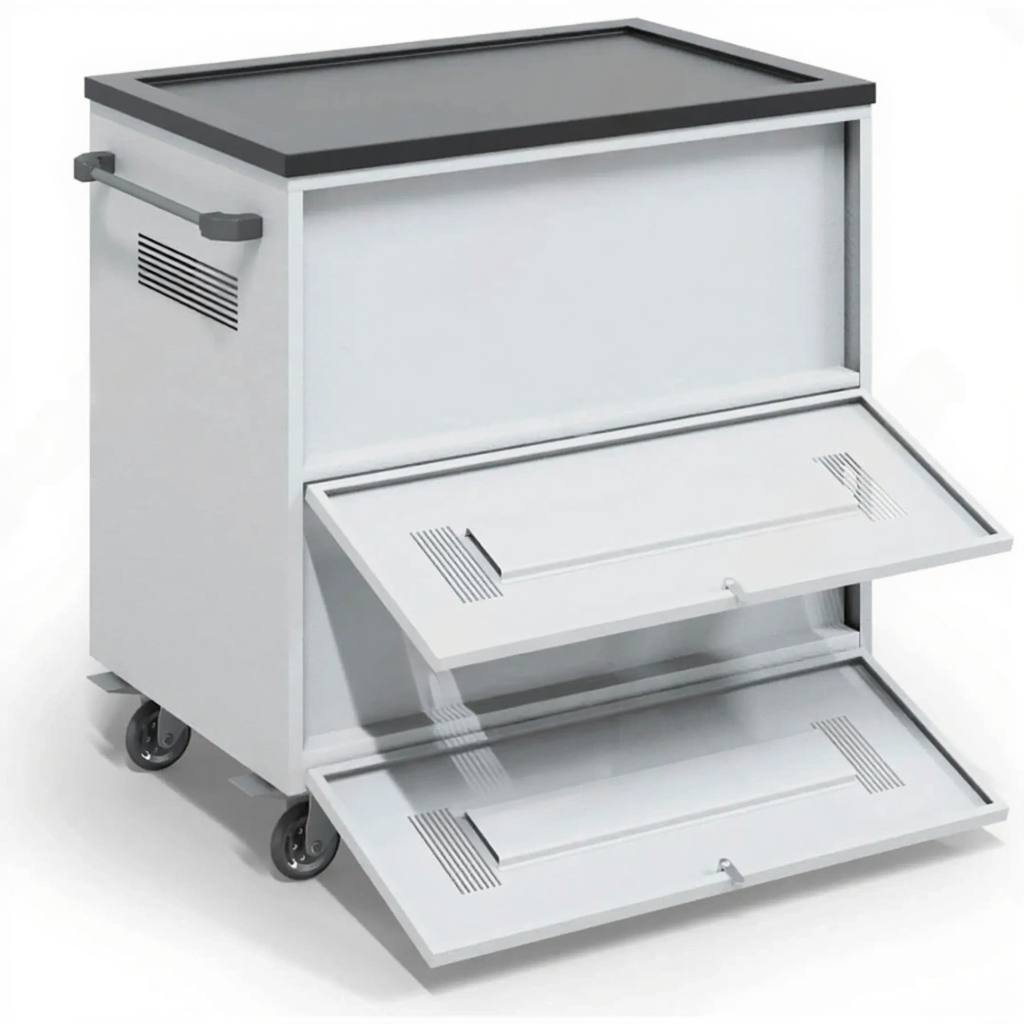 - Максимальная мобильность и безопасность — имеет прочную раму, крупные колеса для перемещения по разным покрытиям и надежную систему запирания (часто несколько замков) для защиты ценного оборудования от кражи.