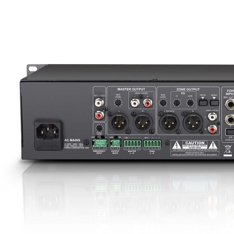 Зонный микшер LD Systems ZONE 423 – полнофункциональный двухзонный микшер с четырьмя линейными и двумя микрофонными каналами, которые можно назначить на Master и Zone выходы, а также оснащен входами для системы пожарного оповещения с собственным регулятором громкости и дистанционным включением/отключением звука. Благодаря универсальным возможностям компактный микшер идеально подойдет для управления фоновым звуком в супермаркетах, отелях, фитнес центрах. Два микрофонных балансных входа оснащены регулировкой чувствительности и кнопкой TalkOver, фантомным питанием 12 В и общим трехполосным эквалайзером. ZONE 423 предалагает линейные, фоно- и AUX-входы с разъемами RCA, FOH-вход в формате балансного стерео TRS, USB и 3,5 мм TRS. USB-порт используется в качестве стереовхода и выхода, и позволяет использовать микшер как внешний аудиоинтерфейс. Четыре входных канала имеют индивидуальные регуляторы для настройки уровня с индикацией сигнала и пиков, 45-мм фейдеры и кнопки Cue. Секции Master и Zone оснащены эквалайзерами, балансными XLR и небалансными RCA выходами. Микшер оснащен выходом для наушников для предпрослушивания, а также выходом для звукозаписи. ZONE 423 высотой 2U и подходит для 19” рэковой стойки.